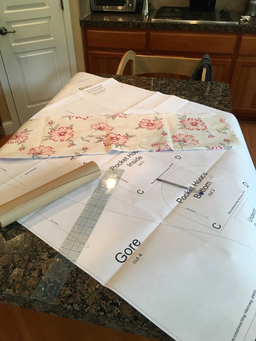 As I mentioned in my last post, for the undergarments, I selected a 3 oz. weight white Irish linen. I purchased 10 yards off of EBay for $9/yd. It’s a 60” wide fabric and should be enough to complete the shift (under dress), the hoop petticote and my undershirt/undershorts. For the pocket panniers (pocket hoops), I selected a pretty pink floral lightweight linen. The undergarments should also be pretty after all!