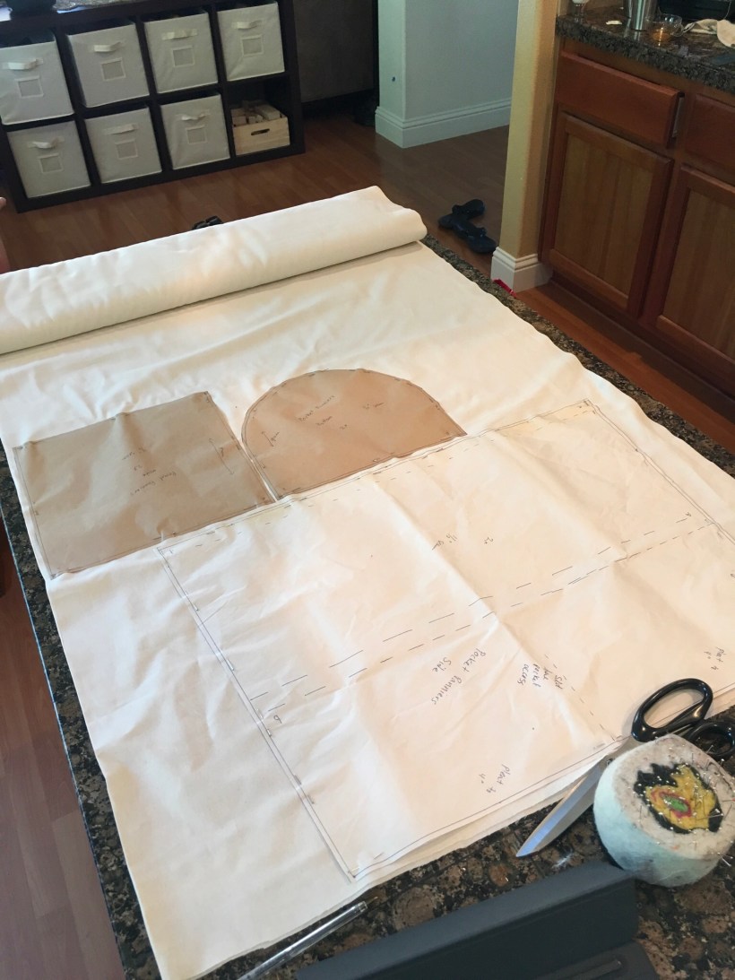 Armed with my knowledge, that I would have to do a full blown mock up, which I normally wouldn’t do, when Sarah picked me up from my trip to Canada, where I selected the silk taffeta for her robe de la Française, we stopped into IKEA and picked up some muslin. Perhaps it’s a little known secret that IKEA sells fabric. Their muslin is $1.99/yd, a great deal. It’s off white, but who cares?