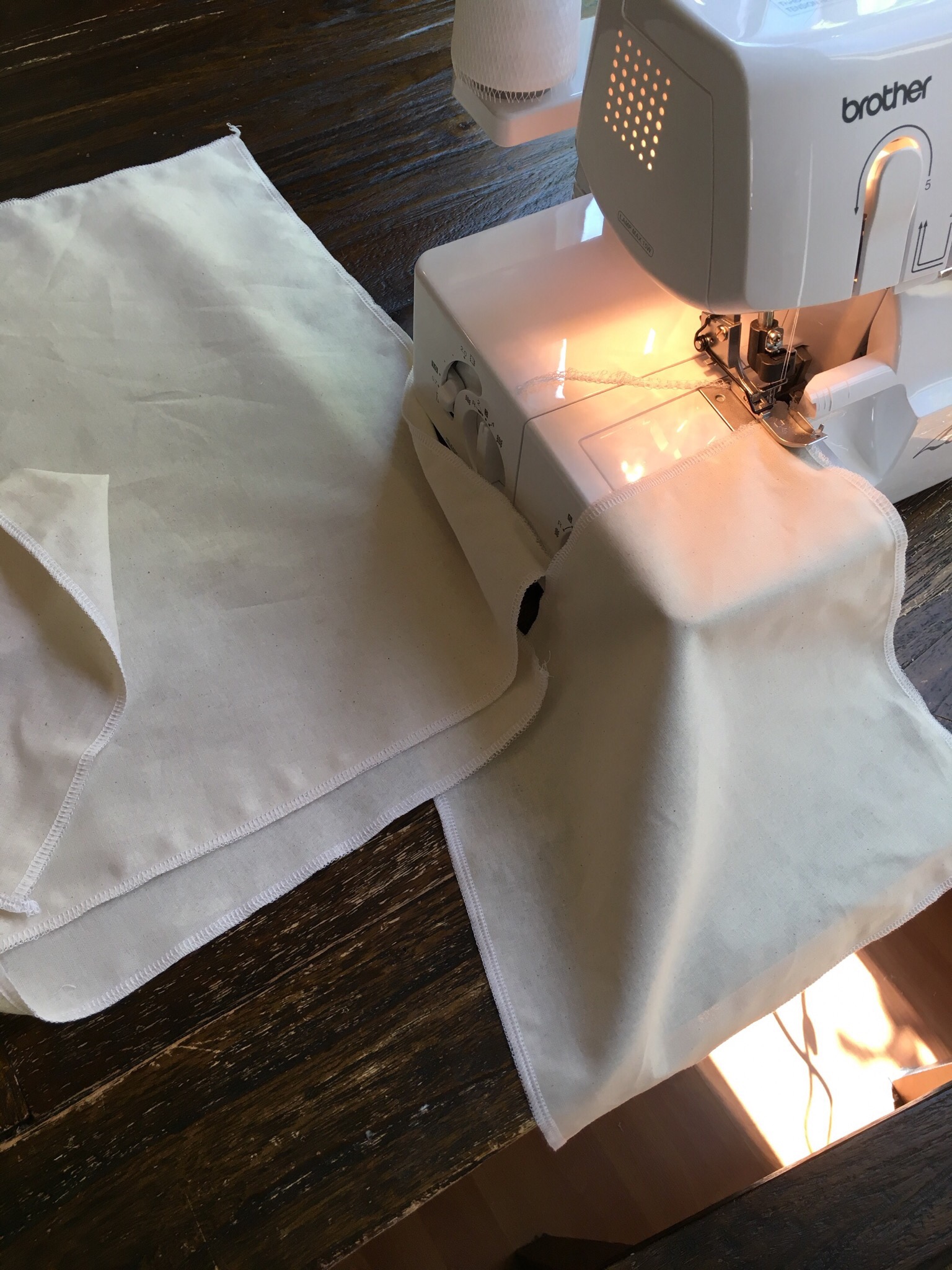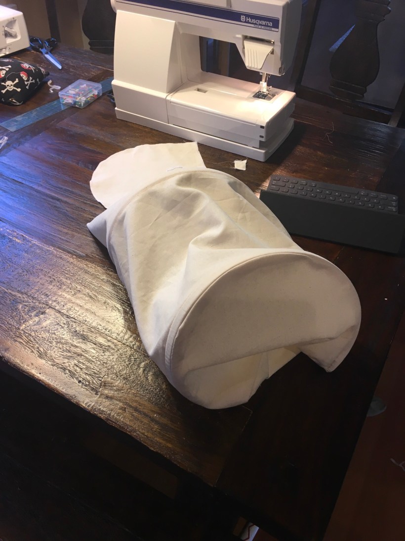 My two sons had fun helping me finish the edges of the fabric. They eventually got bored with the serger and that allowed me to power through the construction. Here I am working on side one of the panniers.