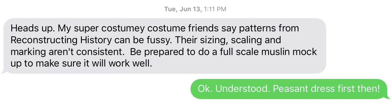 In making a decision about patterns, I chose to purchase my patterns from Reconstructing History. Mostly, because they had a great deal on the complete package of patterns for 18th century French clothing (both man and woman). After sharing pattern selection with Joyce, I got a message form her: