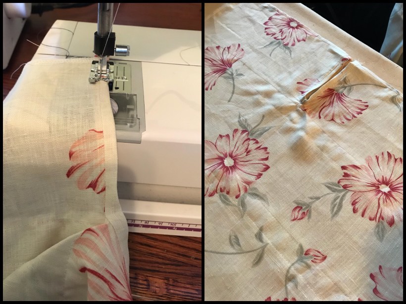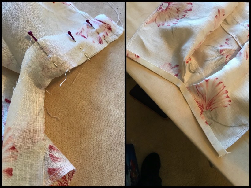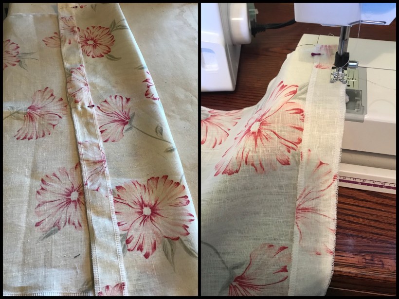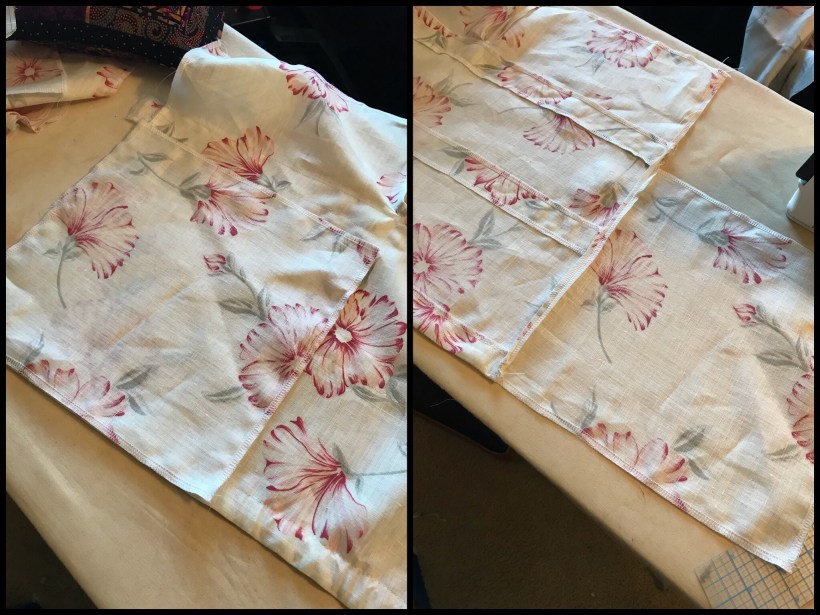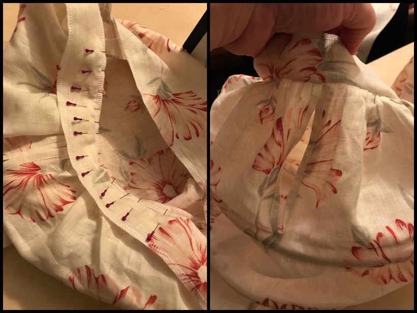 19. Hand baste around the tops of the panniers and gather to 4″ for each side