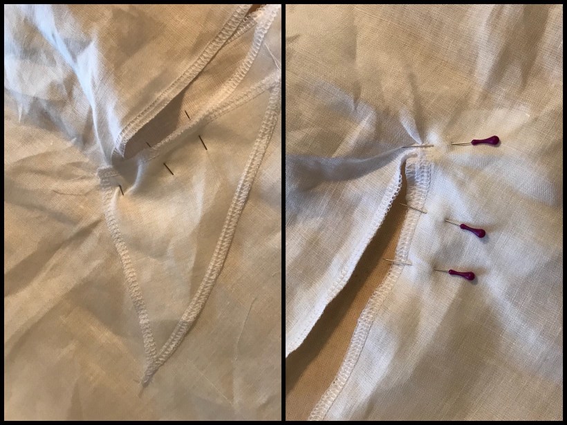 4. Aligning the widest angle of the triangle over the point of each neck slash, right sides together, stitch the the triangle into place
