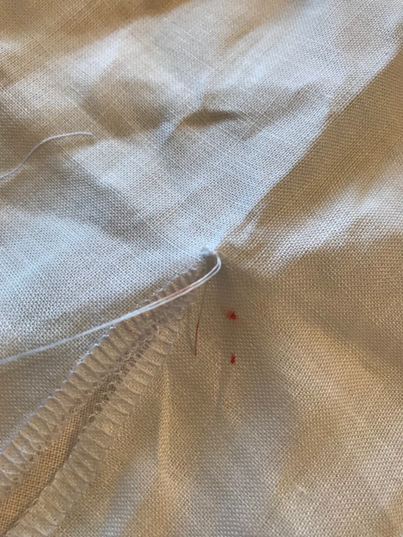 7. Buttonbar tack the bottom of the neck/chest slash, being careful not to stab yourself with the needle, like me! LOL (thank goodness for modern day stain removers).