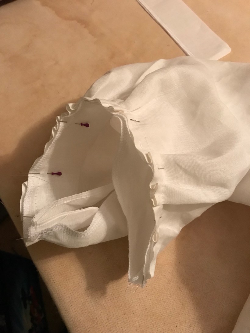 21. Hand baste 1/4″ in from end of sleeve and gather the sleeves to fit the cuff size