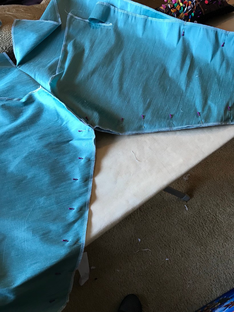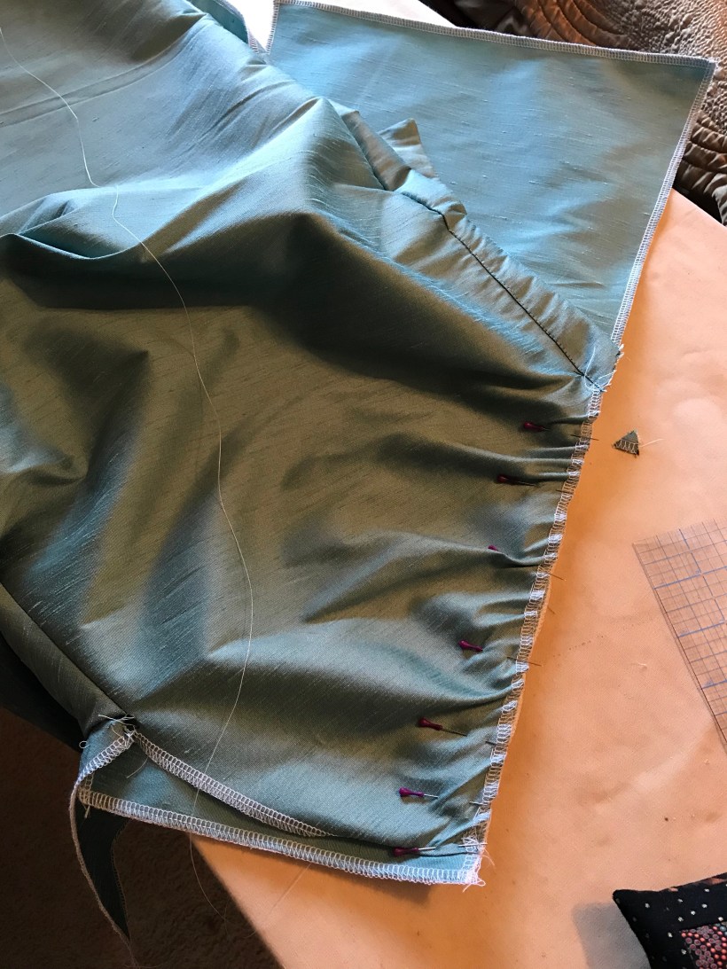 Unfortunately, my camera just can’t get the color of the breeches right, but I chose a robin’s egg blue silk. This picture however, is likely, the closest to the true color. Here the fronts are being stitched to the back breeches.