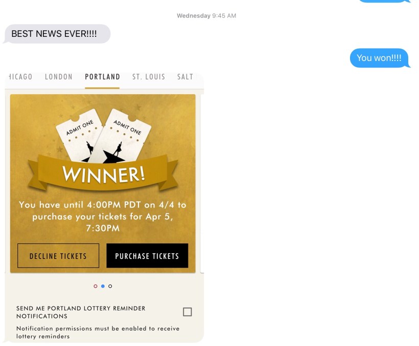 So, when the show finally arrived in town, we both downloaded the app for Hamilton (upon her insistence). Perhaps a little known secret is that within the app, there is a daily lottery where you can enter the lottery to purchase tickets for $10/person. The tickets are for the following day, so you definitely need to have a flexible schedule if you win.