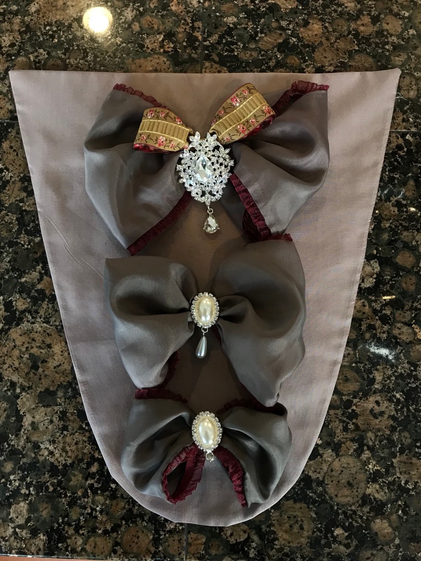 Above, you can see the piece coming together. Using some of the furbelows I’ve been making for the robe, I made some simple, large bows that get just slightly smaller as they go down the stomacher. Adding some rhinestones and pearls along the way, the piece started to look very elegant, at least in my opinion.