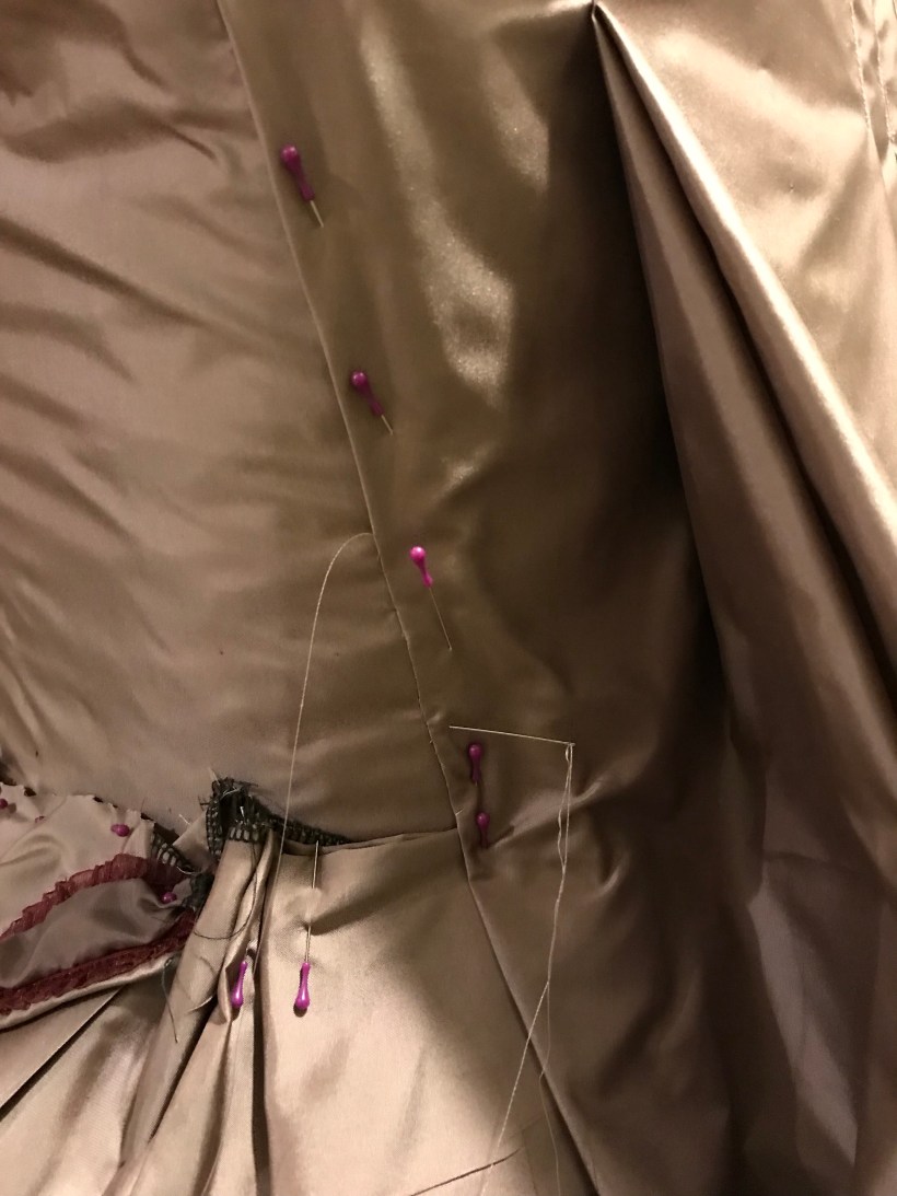 Make sure before you cut off the excess portion of the front skirts, that a seam allowance is added to sew the front skirts to the bodice. In the image above, you can start to see the robe form as I’ve pined it to the stomacher to make sure the fit is right.