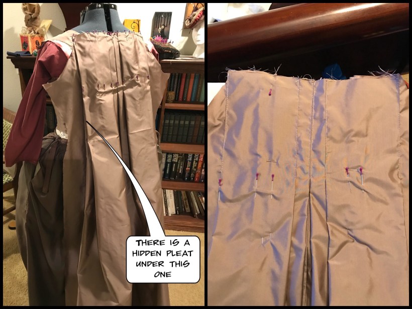 13. Pin the sacque back onto the model/dress form to ensure it fits across the back nicely. The back should extend across the entire back. Make sure the pleats look uniform and to your liking. The instructions from Cox and Stowell discuss adding a hidden pleat on the sides of the back and how key this is in the back laying properly. Please pay attention to this remark