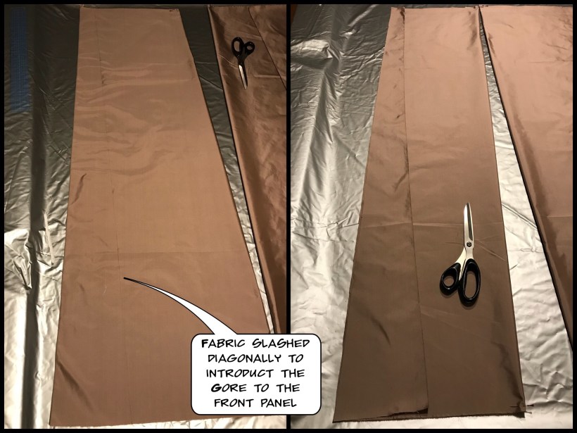 Two of the panels will be used for the back port of the front skirts and two will be used for the front facing portion of the gown. Follow the instructions for making the gore out of the two front panels. I’m not going to detail the instructions here because I think what the authors did is clever and they deserve proper credit and royalties for their resourcefulness. Please refer to their book.