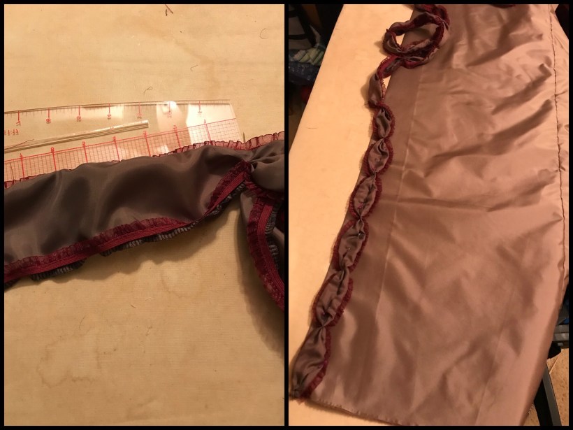 For the furbelows, I chose to use the lining fabric primarily because I was running on “fashion fabric vapor” and knew I would NOT have enough of the silk to get them all done. In hindsight, I really like the contrast the lining gives on the robe. I selected a 3/8 inch burgundy elastic trim and I think it looks fancy and pretty!