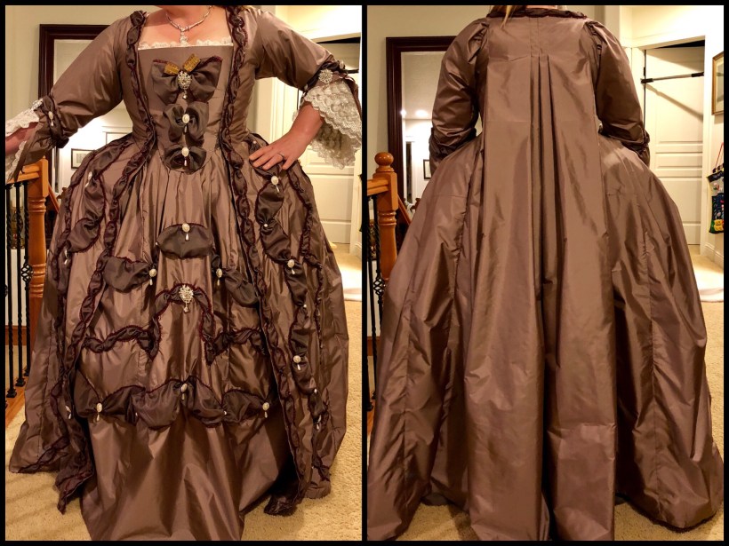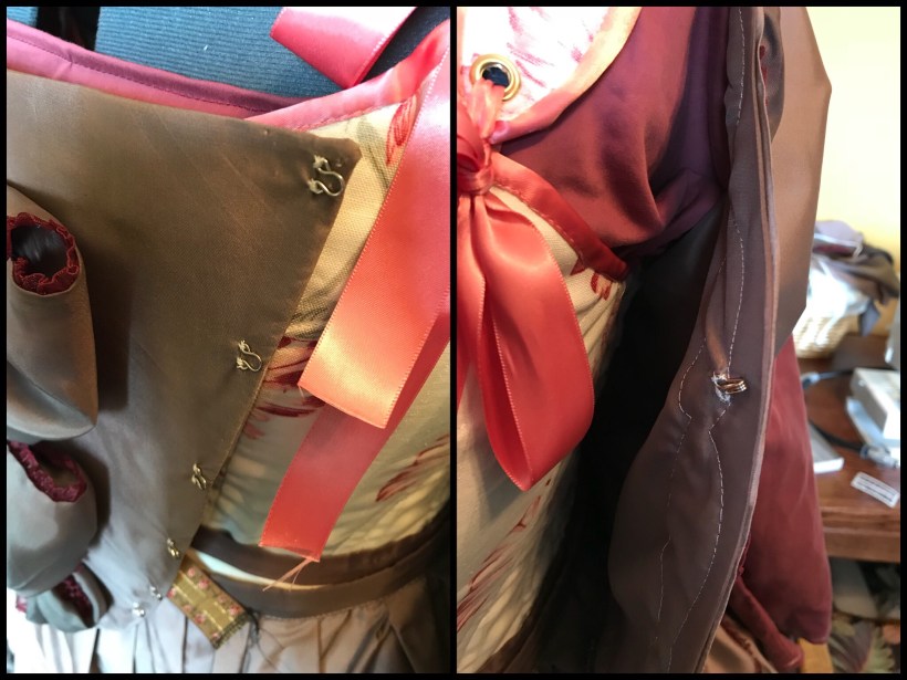 I’m pretty happy with how this sacque gown turned out. Especially for my first one! One area I’m just going to deal with on the day of Fêtes is where the stomacher meets the robe. I think I’ll just end up whip stitching it for the evening. The hooks and yes do a good job holding everything together, but you can just see them if you’re looking close.