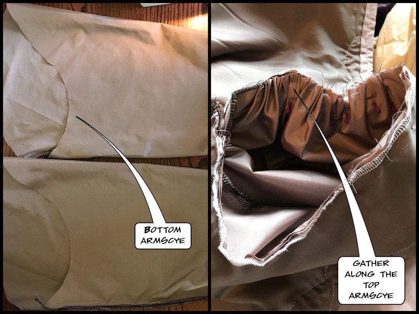 1. Run a basting stitch about a 1/4″ in from the seam to gather along the top of the armscye