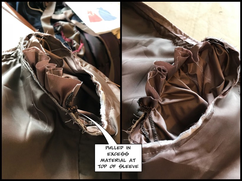 I pulled out the sleeve re-gathered the sleeve in this area about 2.5 inches in from the seam and reset the sleeve.