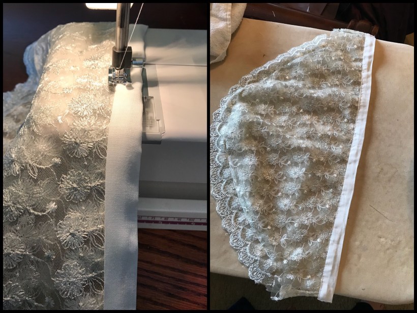 I’ve chosen a 3-layered flounce to go on the ruffle. First, I cut away the border of the lace, so that I could reattach later. Using Cox & Stowell’s pattern, I cut out the flounces. Next, I pinned at stitched the lace border back to the flounces (shown below).