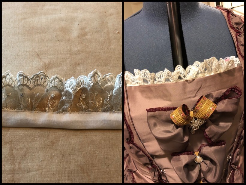 Measuring across the top of the stomacher, I cut out some of the lace I used for the flounces, attached to some bias tape and used some stitch witchery to attach to the stomacher.