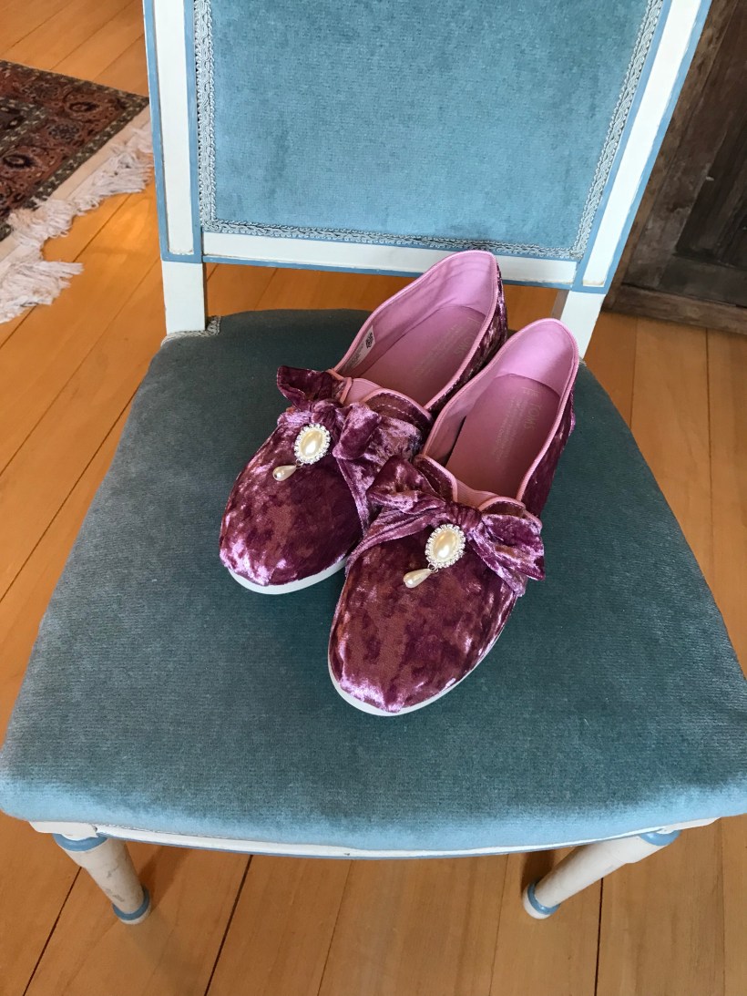 One thing that Sarah felt pretty strong about is foot comfort. She expressly did not want to stand in heels for several hours. That being said, I went on the hunt for a comfortable modern shoe that would look pretty with the sacque. Tom’s had a pair of velvet flats with a small bow in a pretty crushed pinkish/purplish velvet. Done.