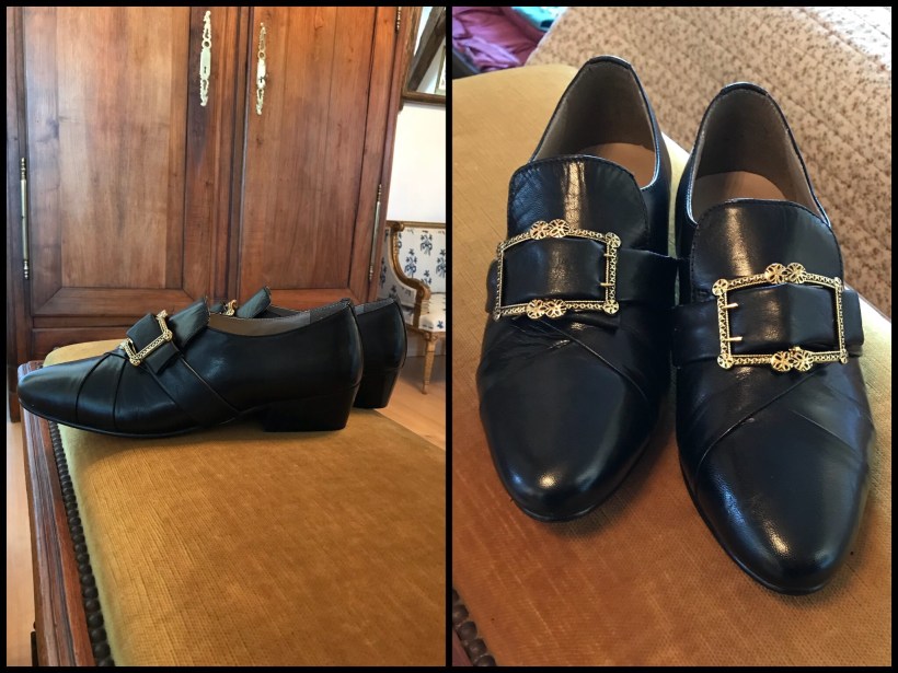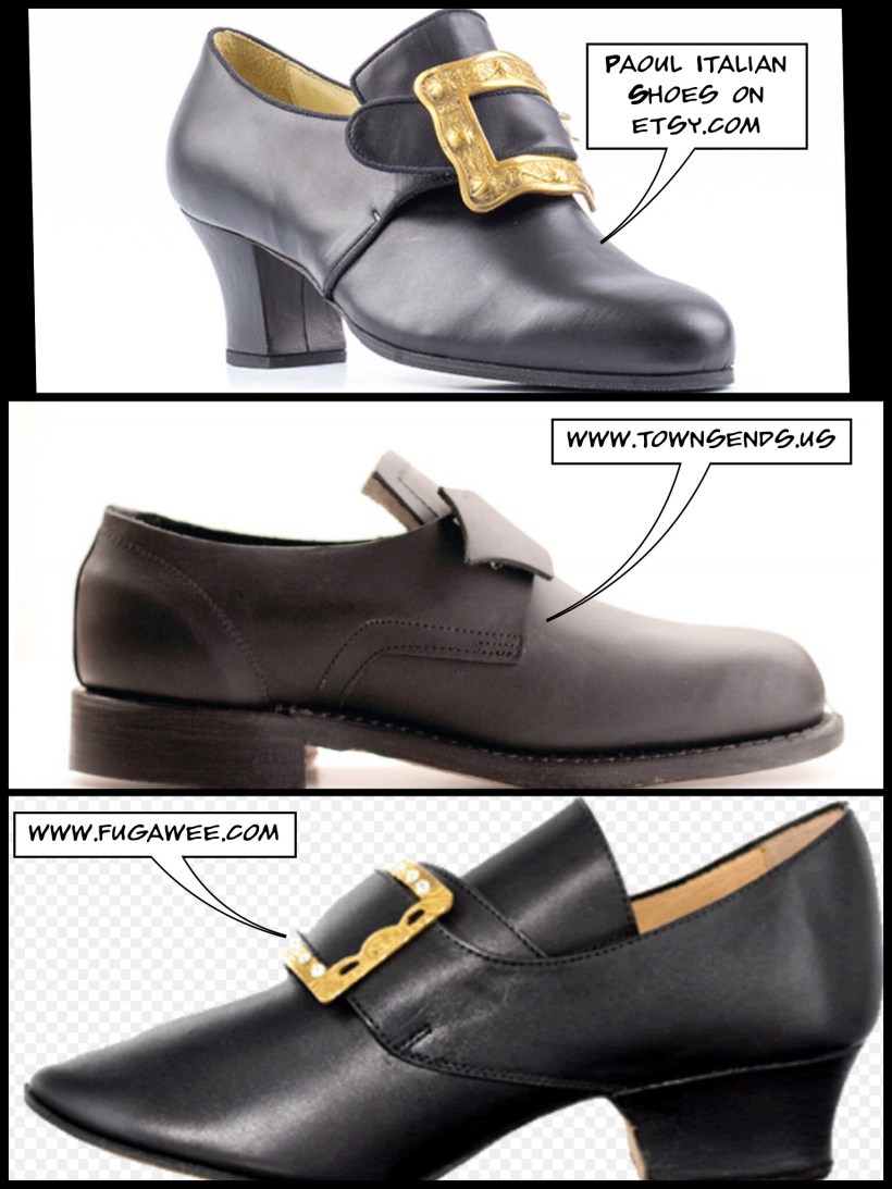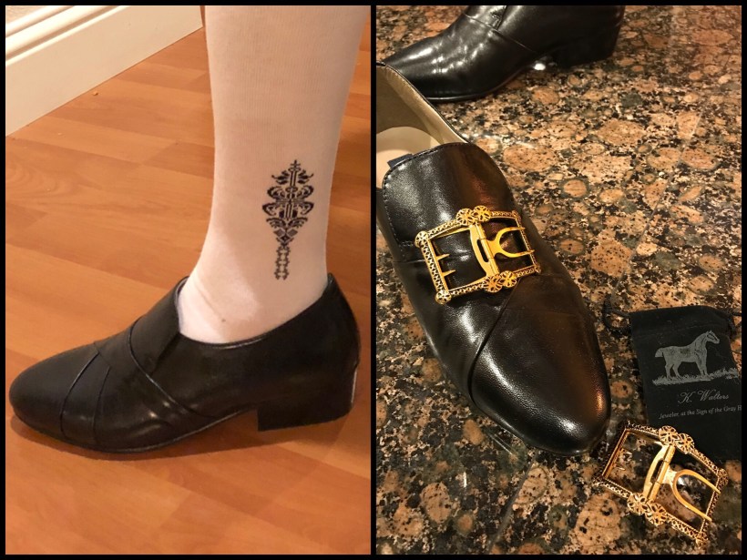 Below are the shoes I purchased off of amazon.com. To the right are the buckles I selected from the Sign of the Gray Horse shop on etsy.com. Docked stockings were purchased from Townsends.